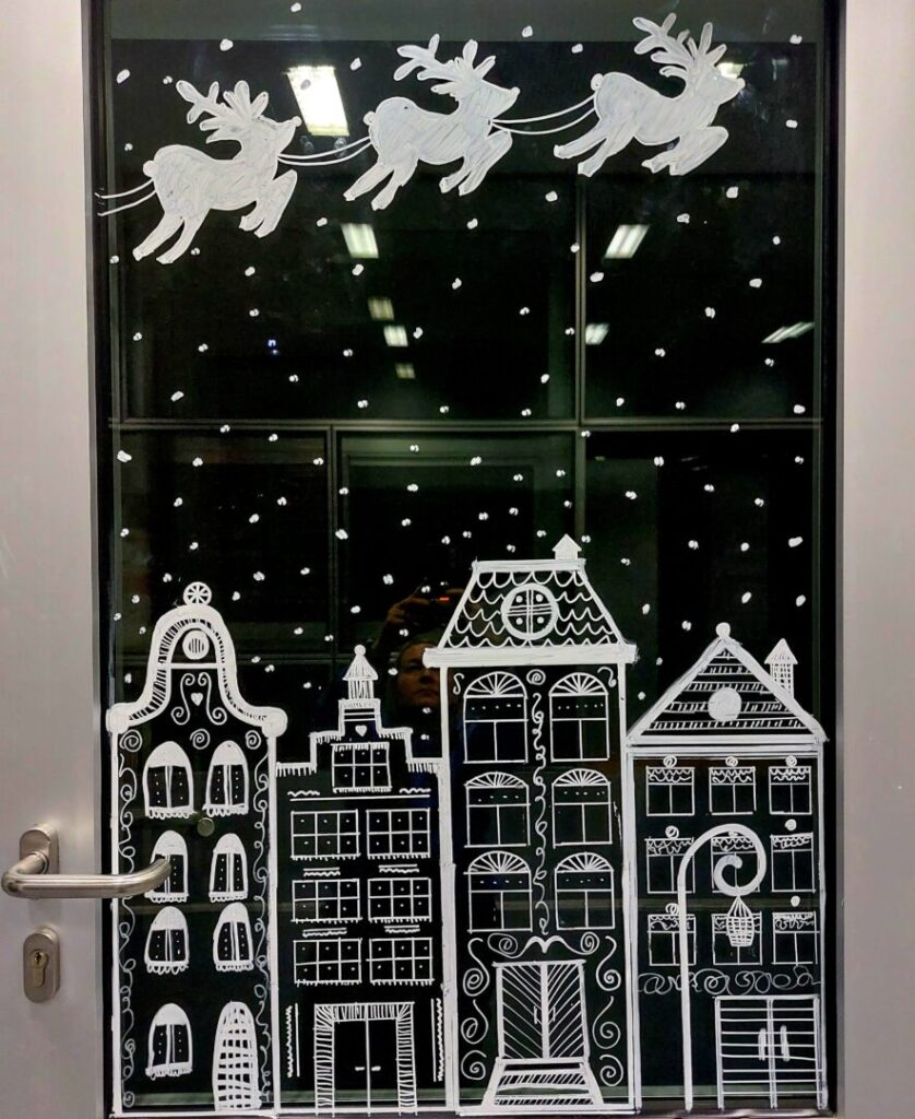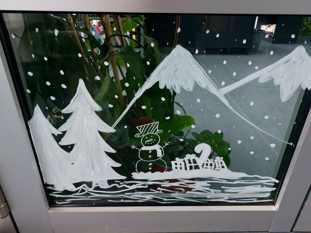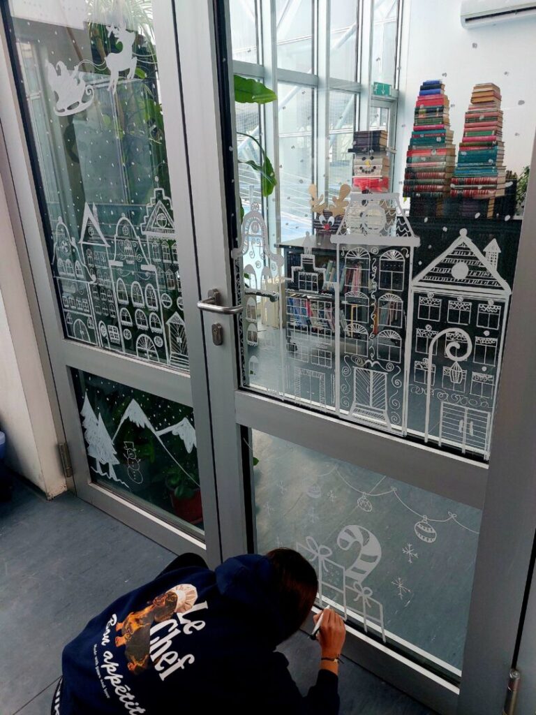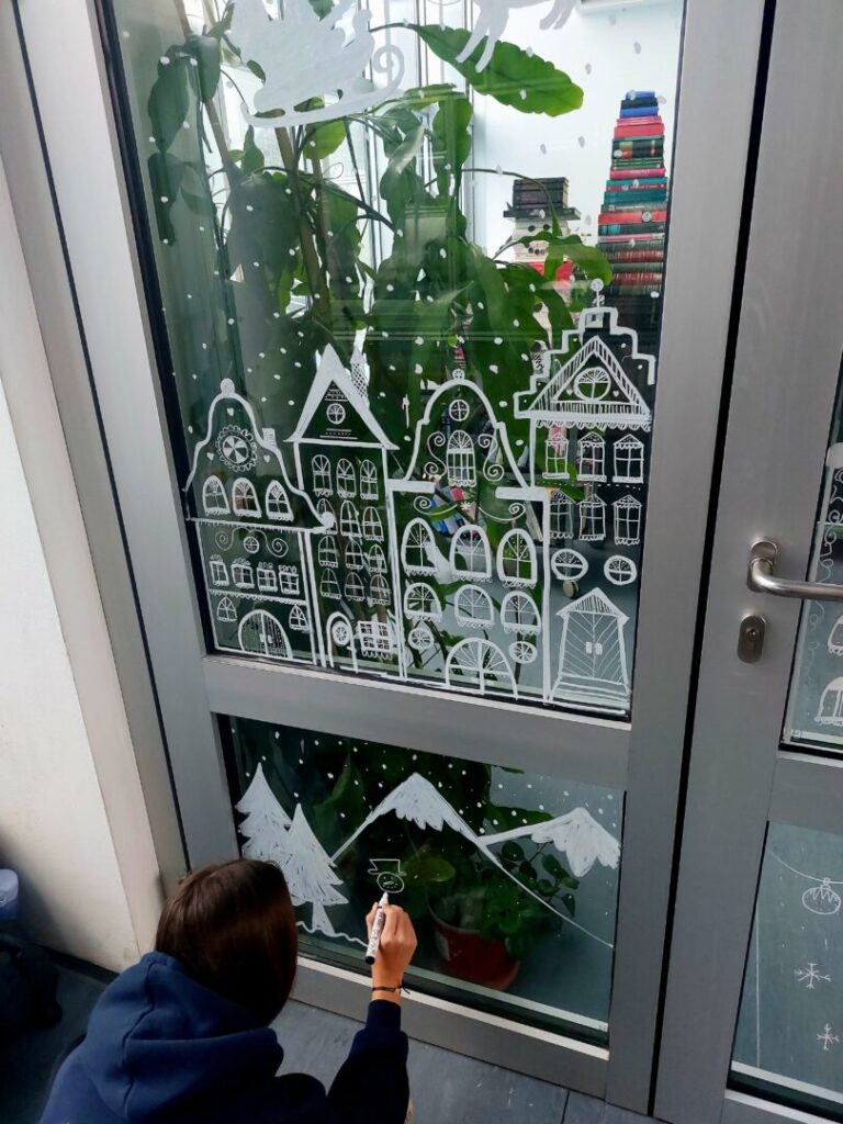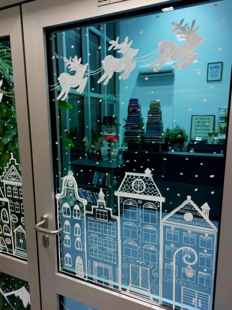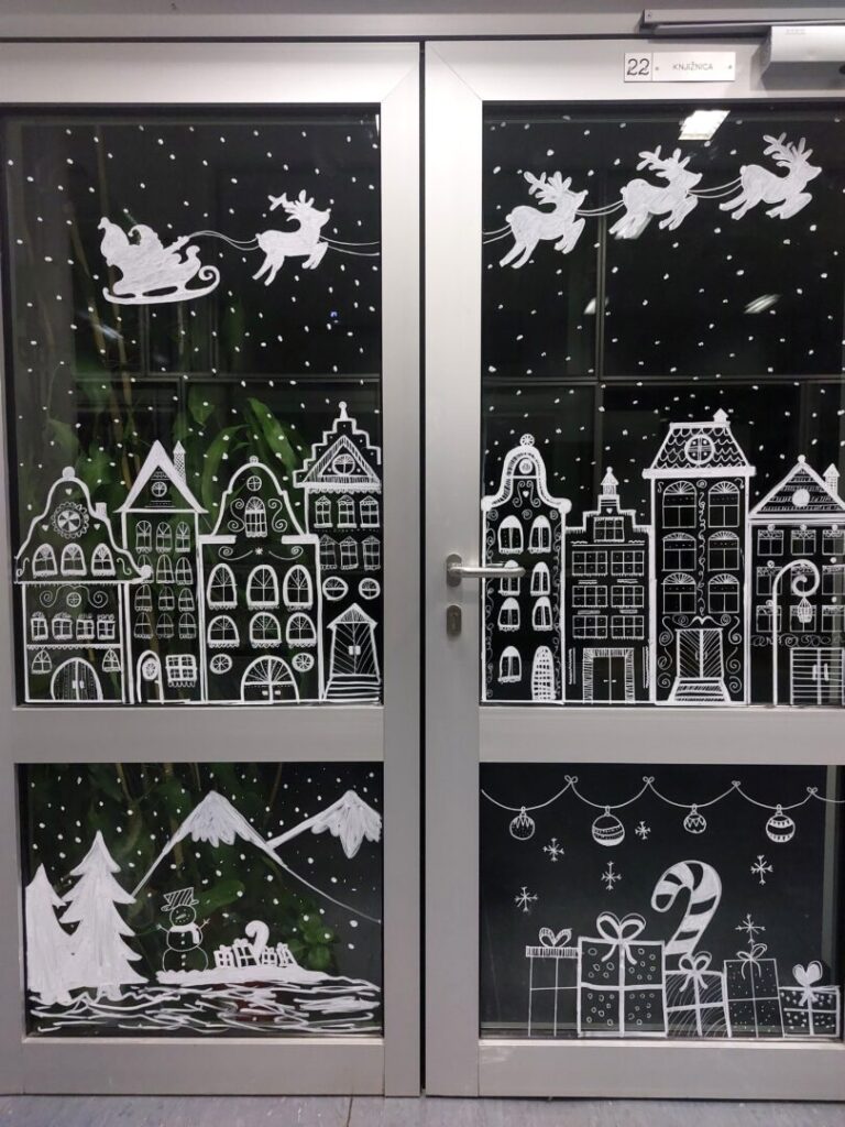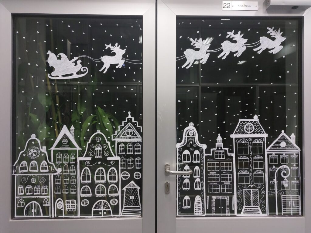 Učenice iz 2. C razreda oslikale su staklene stijene ulaza i predvorja škole božićnim motivima.