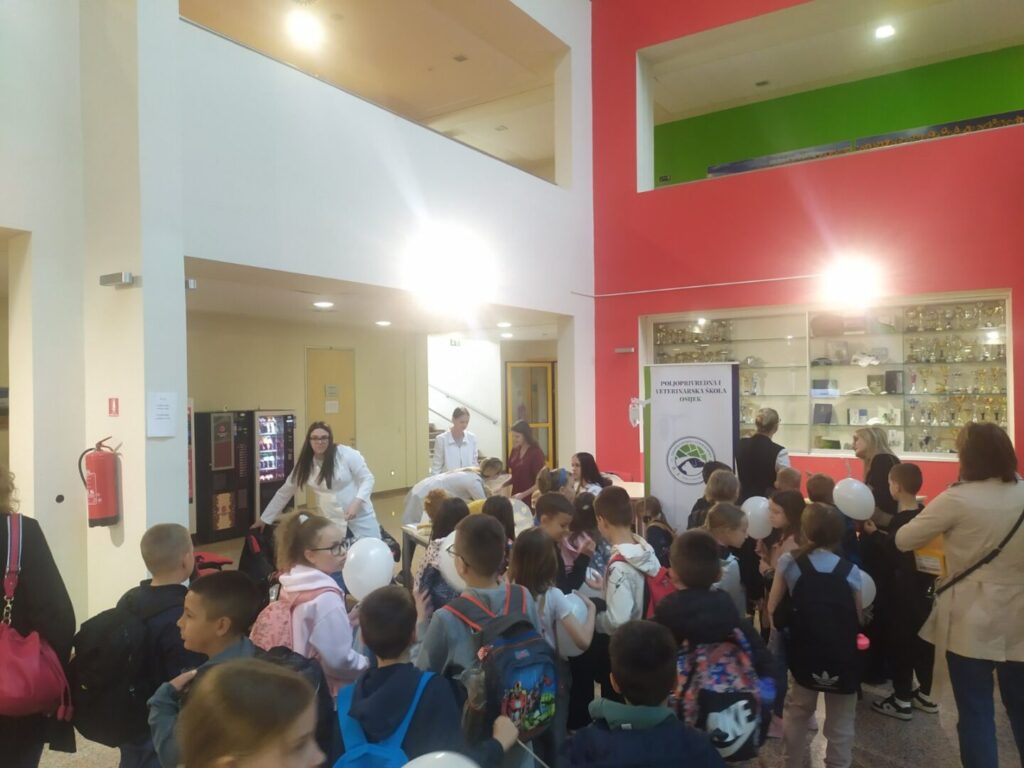 Ove godine smo zajedno sa Pravnim fakultetom i njihovom Zelenom pravnom klinikom, Fakultetom agrobiotehničkih znanosti Osijek, Policijskom upravom osječko-baranjskom -Odjel za prevenciju te Kinološkim društvom Osijek sudjelovali na Festivalu znanosti. Učenici 3. razreda veterinarskog smjera s profesorom Kralikom imali su pokaz osnovne veterinarske skrbi za pse gdje su prezentirali sadržaj sveobuhvatnog vodiča za njegu štenaca i održali pokaznu vježbu parenteralne aplikacije lijekova, pokazali postupak mikročipiranja, postavljanja intravenskog katetera i davanja infuzije (fiziološke otopine). U nastavku možete pogledati fotografije i Sveobuhvatan vodič za njegu štenaca.