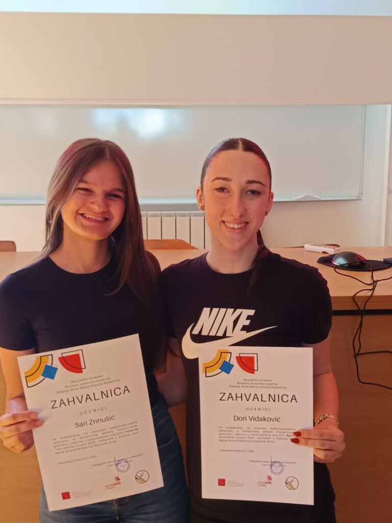 Čestitamo našim maturanticama Sari i Dori na izvrsnom rezultatu izlučnog natjecanja WorldSkills Croatia koje je održano u Srednjoj školi Matije Antuna Reljkovića u Slavonskom Brodu. Sara je u disciplini Veterina zauzela 3. mjesto, a Dora 5. u disciplini Agro.